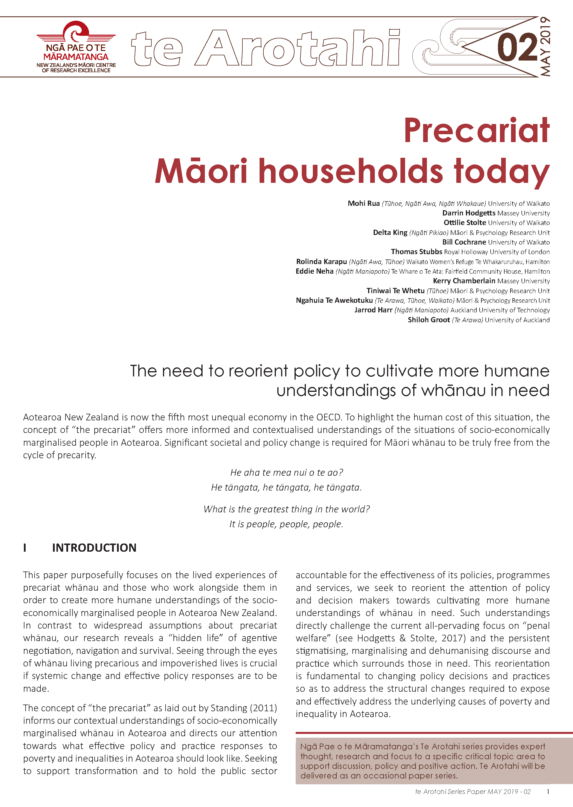 Rua, M., Hodgetts, D., Stolte, O., King, D., Cochrane, B., Stubbs, T., Karapu, R., Neha, E., Chamberlain, K., Te Whetu, T., Te Awekotuku, N., Harr, J., Groot, S., (2019). Precariat Māori Households Today (Te Arotahi Series Paper, May 2019 No. 02). Auckland: N.Z. Published by Ngā Pae o te Māramatanga New Zealand’s Māori Centre of Research Excellence.