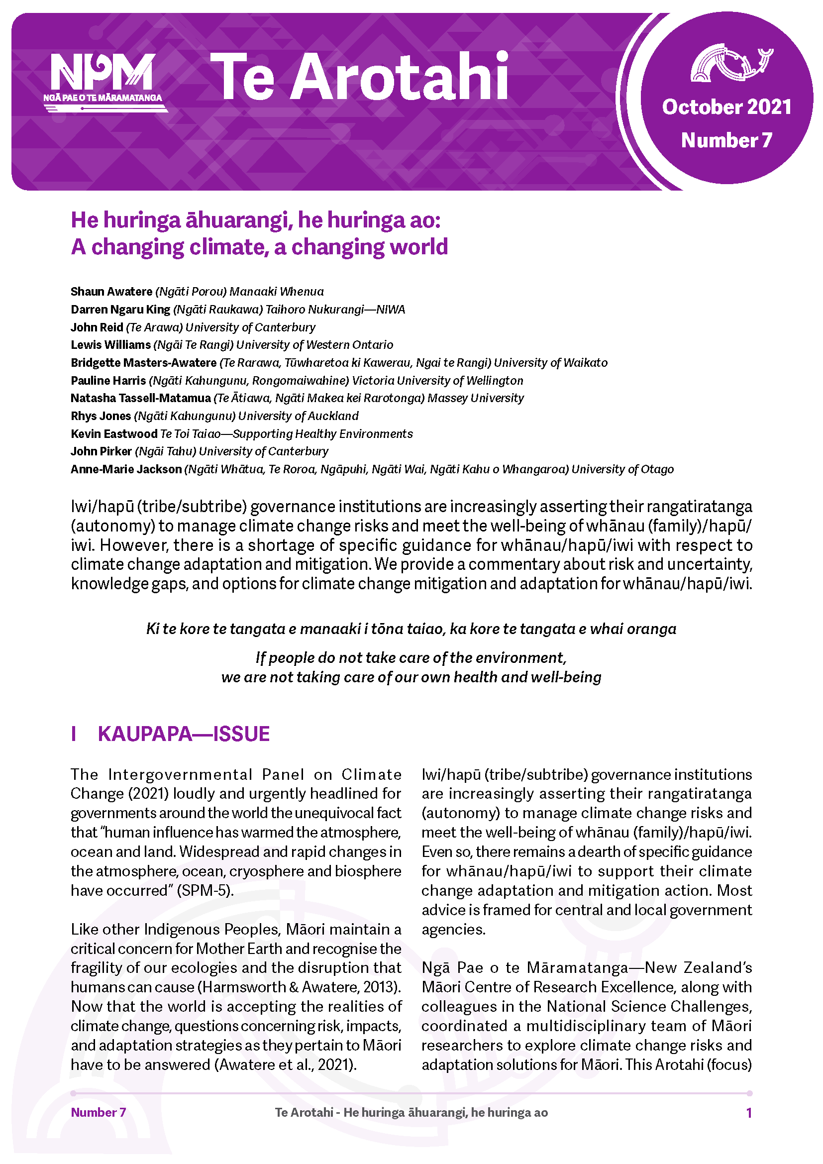 Shaun Awatere (Ngāti Porou) Manaaki Whenua, Darren Ngaru King (Ngāti Raukawa) Taihoro Nukurang - NIWA,  John Reid (Te Arawa) University of Canterbury, Lewis Williams (Ngāi Te Rangi) University of Western Ontario, Bridgette Masters-Awatere (Te Rarawa, Tūwharetoa ki Kawerau, Ngai te Rangi) University of Waikato, Pauline Harris (Ngāti Kahungunu, Rongomaiwahine) Victoria University of Wellington, Natasha Tassell-Matamua (Te Ātiawa, Ngāti Makea kei Rarotonga) Massey University, Rhys Jones (Ngāti Kahungunu) University of Auckland, Kevin Eastwood Te Toi Taiao—Supporting Healthy Environments, John Pirker (Ngāi Tahu) University of Canterbury, Anne-Marie Jackson (Ngāti Whātua, Te Roroa, Ngāpuhi, Ngāti Wai, Ngāti Kahu o Whangaroa) University of Otago